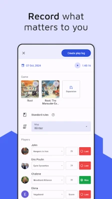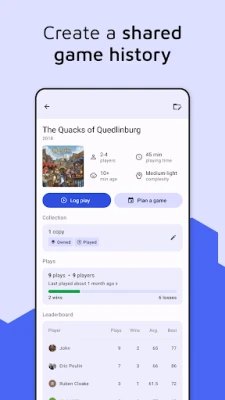 Nema više zaboravljenih pobeda ili ključnih strategija! Aftergame vam omogućava da vodite zajednički dnevnik za svaku partiju, beležeći svaki uspeh, taktiku i poseban trenutak. Ovi detaljni zapisi biće dostupni svim učesnicima, čineći svaku igru delom zajedničke istorije. Lako integrišite svoju kompletnu kolekciju igara i istoriju igranja, uključujući uvoz podataka sa BGG-a i drugih izvora, uz pametno prepoznavanje ažuriranja kako bi se izbeglo dupliranje. Istražite obimnu biblioteku sa preko 100.000 društvenih igara, sa novim naslovima koji se dodaju svake nedelje. Detaljne informacije poput mehanika, kompleksnosti, uloga igrača i scenarija su vam nadohvat ruke, uz još više opcija koje uskoro stižu.