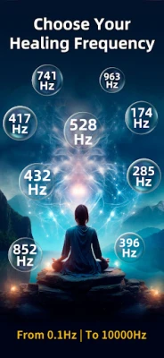 Upoznajte moć specifičnih frekvencija, svaka sa svojom jedinstvenom svrhom. Od 174 Hz za ublažavanje bola i stresa, preko 285 Hz za obnavljanje tkiva, do 396 Hz koja oslobađa od osećaja krivice i straha. Prepustite se 417 Hz za nove početke i uklanjanje negativne energije, doživite smanjenje anksioznosti uz 432 Hz, i otkrijte čudesnu transformaciju sa 528 Hz. Frekvencije poput 639 Hz jačaju međuljudske odnose, 741 Hz budi intuiciju i detoksikuje, dok 777 Hz donosi moćno opuštanje. Aplikacija Frequency vam nudi put ka duhovnoj ravnoteži sa 852 Hz i dostiže prosvetljenje uz 963 Hz, oplemenjujući vašu svest i mudrost.