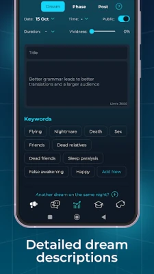 Otkrijte skrivene poruke vaše podsvesti uz našu intuitivnu funkciju tumačenja snova. LucidMe pruža dragocene uvide u univerzalne simbole i teme, pomažući vam da dešifrujete ono što vaš um pokušava da vam kaže. Kroz ovo duboko razumevanje, stičete neprocenjivu samospoznaju i podstičete lični rast, obogaćujući svoje iskustvo spoznaje. Pored toga, LucidMe vas oprema proverenim tehnikama osmišljenim da poboljšaju prisećanje snova i, što je najuzbudljivije, da vas dovedu do lucidnih snova, gde svesno učestvujete u svom sanjanom svetu.