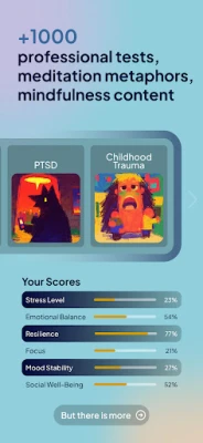 Uronite u duboko razumevanje sopstvenog uma uz preko 70 mentalnih testova koji obuhvataju ličnost, psihologiju, stil života i raspoloženje. Posebni testovi za traumu, bipolarni poremećaj, depresiju, ADHD i PTSP nude ciljane procene za negu vašeg mentalnog zdravlja. Unapredite svoje blagostanje sa više od 300 praktičnih uvida u 12 ključnih kategorija, od odnosa do ličnog razvoja, pažljivo sastavljenih od strane naših stručnjaka. Pratite svoj napredak detaljnim statistikama, dok dnevni dnevnik i praćenje raspoloženja omogućavaju prilagođenu refleksiju na vašem putovanju, beležeći tekst, emocije i aktivnosti.