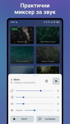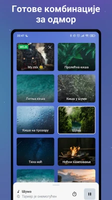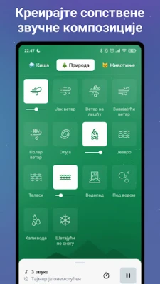 Zaboravite na jednostrane, unapred definisane opcije. Naša aplikacija vam omogućava da budete sopstveni majstor zvuka, kreirajući savršene mešavine prilagođene isključivo vašim potrebama. Uronite u bogatu paletu pažljivo odabranih zvučnih kategorija: od blagih kapi kiše koje dobuju po prozorima do gromoglasnih oluja, preko umirujućih šumova prirode kao što su morski povetarac i žuborenje potoka. Dodajte dodir divljine uz cvrkut ptica ili umiljato predenje mačke, ili pak uneste poznate zvuke doma poput starog sata i veš mašine. Čak i urbani ritmovi grada, pažljivo odabrani, mogu poslužiti kao pozadina za vašu koncentraciju. Svaka kategorija nudi jedinstvene opcije koje možete slobodno kombinovati i podesiti njihovu jačinu, stvarajući jedinstvenu ambijentalnu atmosferu za san ili fokus.