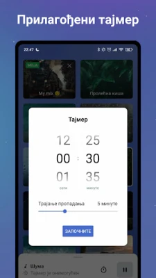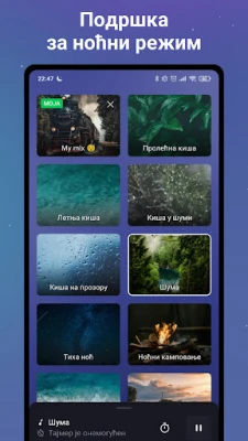 Pored bogatstva zvučnih opcija, ova aplikacija je osmišljena za vašu potpunu udobnost. Omogućeno vam je neometano reprodukovanje odabranih zvučnih pejzaža u pozadini, što znači da možete istovremeno koristiti druge funkcije telefona bez prekida. Ugrađeni prilagodljivi tajmer nudi dodatnu bezbrižnost: jednostavno ga podesite i pustite da se zvuci glatko utišaju kada ste već utonuli u san, čuvajući bateriju vašeg uređaja. Sa preko 50 različitih umirujućih zvukova, opcijom podsetnika za odlazak na spavanje i tamnim režimom za prijatnije korišćenje noću, sve je podređeno vašem opuštanju i poboljšanju kvaliteta života. Dopustite da vam pomognemo da pronađete svoj zen.